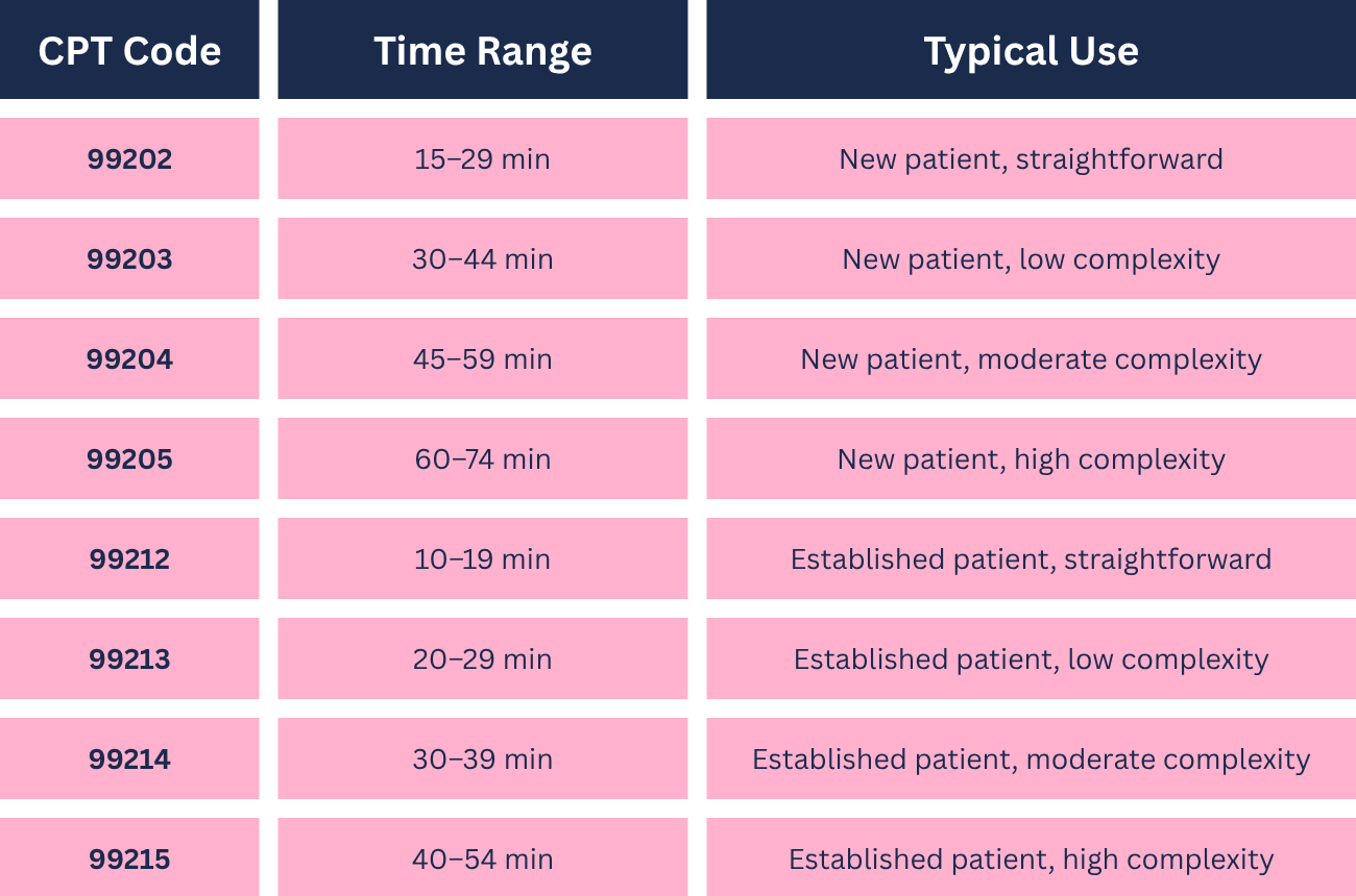 Disclaimer: This content is for informational and educational purposes only and does not constitute legal, billing, or financial advice. Providers should consult qualified coding professionals, payers, and legal counsel to ensure compliance with current CPT®, payer, and state regulations when implementing time-based or cash-pay billing models.