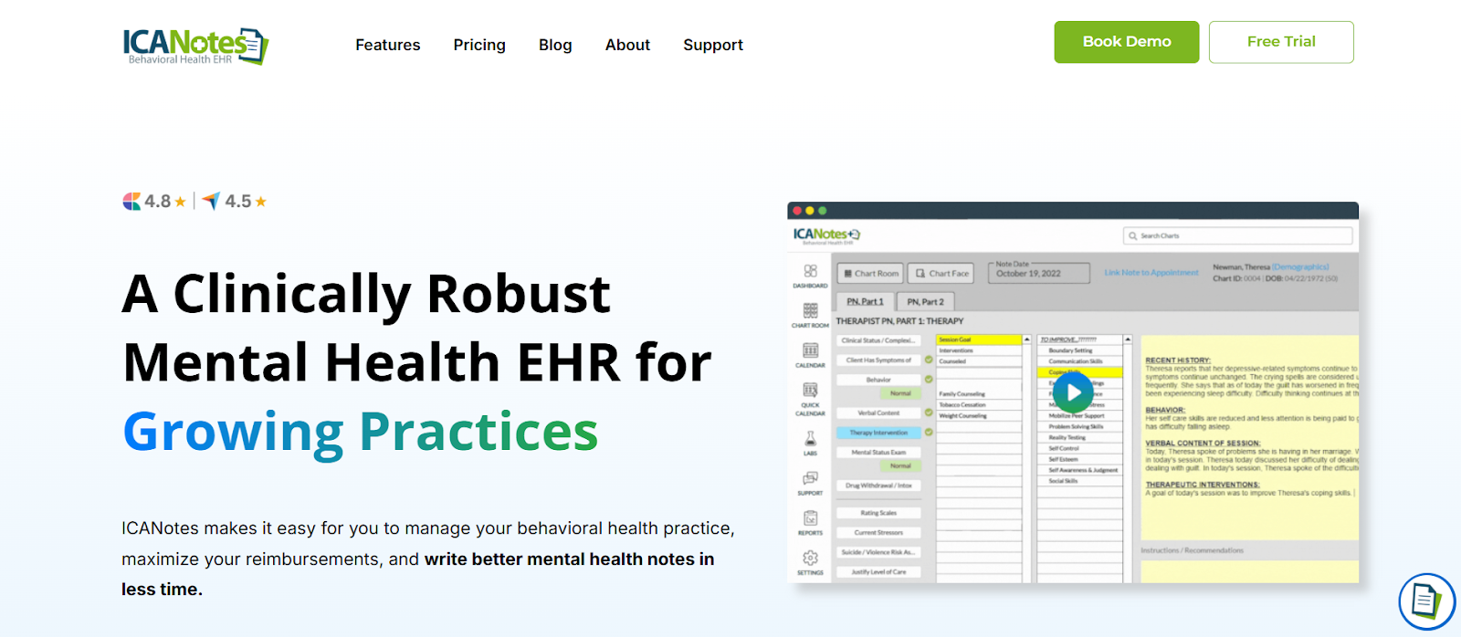 ICANotes is known for its quick, click-through documentation that helps providers complete notes efficiently. It’s especially popular among psychiatrists.