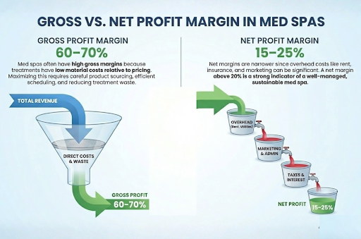 By monitoring both gross and net profit margins, med spa owners can identify where improvements are needed and implement targeted strategies to enhance profitability.