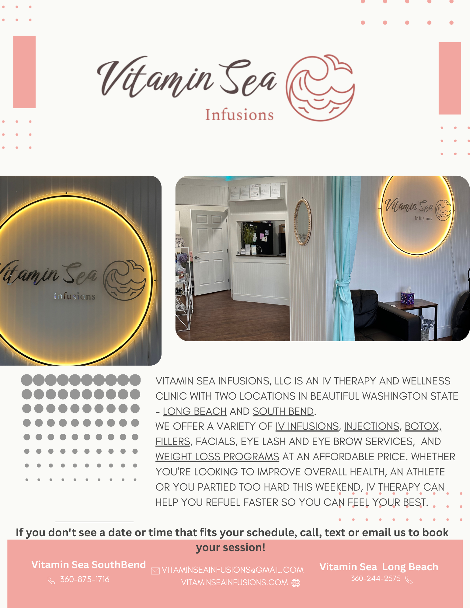 Vitamin Sea Infusions, LLC is an IV therapy and wellness clinic with two locations in beautiful Washington State - Long Beach and South Bend.